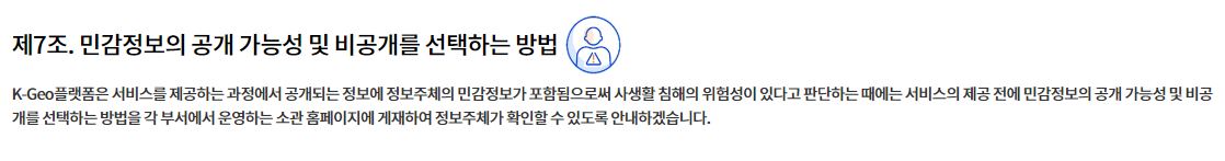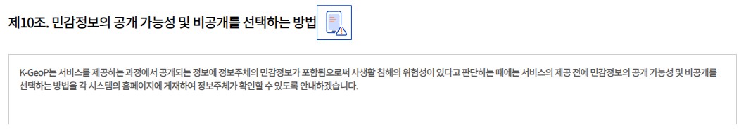- K-GeoP는 서비스를 제공하는 과정에서 공개되는 정보에 정보주체의 민감정보가 포함됨으로써 사생활 침해의 위험성이 있다고 판단하는 때에는 서비스의 제공 전에 민감정보의 공개 가능성 및 비공개를 선택하는 방법을 각 시스템의 홈페이지에 게재하여 정보주체가 확인할 수 있도록 안내하겠습니다.