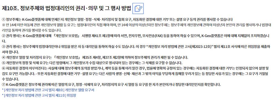 - ② 권리 행사는 K-GeoP에 대해 「개인정보 보호법」 시행령 제41조 제1항에 따라 서면, 전자우편, 팩스(FAX) 등을 통하여 하실 수 있으며, K-GeoP는 이에 대해 지체없이 조치하겠습니다.