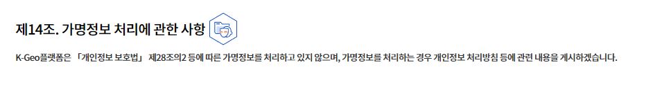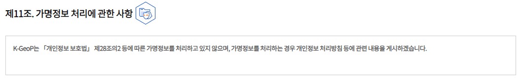 - K-GeoP는 「개인정보 보호법」 제28조의2 등에 따른 가명정보를 처리하고 있지 않으며, 가명정보를 처리하는 경우 개인정보 처리방침 등에 관련 내용을 게시하겠습니다.