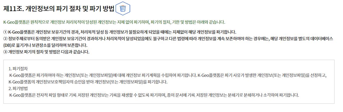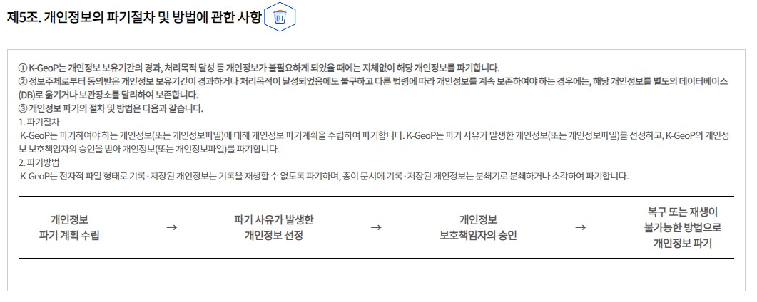 - ① K-GeoP는 개인정보 보유기간의 경과, 처리목적 달성 등 개인정보가 불필요하게 되었을 때에는 지체없이 해당 개인정보를 파기합니다.