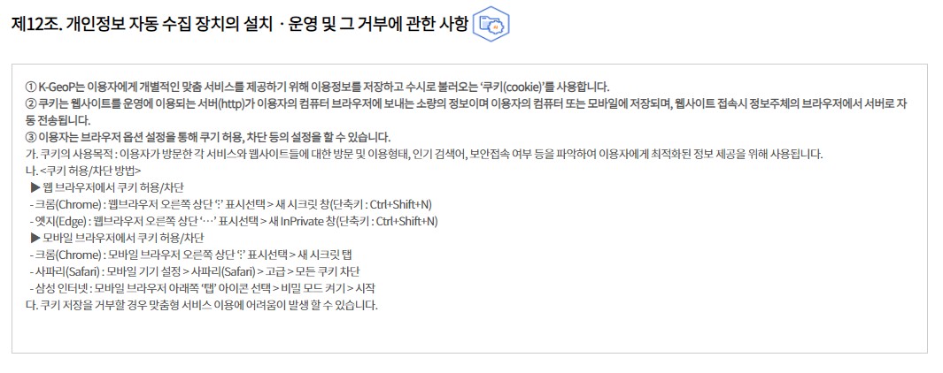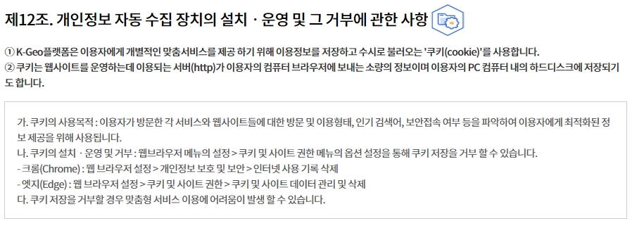 - ① K-GeoP는 이용자에게 개별적인 맞춤 서비스를 제공하기 위해 이용정보를 저장하고 수시로 불러오는 ‘쿠키(cookie)’를 사용합니다.