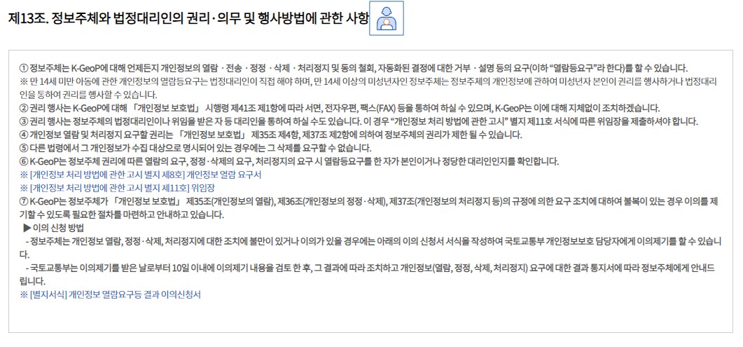 - ① 정보주체는 K-GeoP에 대해 언제든지 개인정보의 열람ㆍ전송ㆍ정정ㆍ삭제ㆍ처리정지 및 동의 철회, 자동화된 결정에 대한 거부ㆍ설명 등의 요구(이하 “열람등요구”라 한다)를 할 수 있습니다.