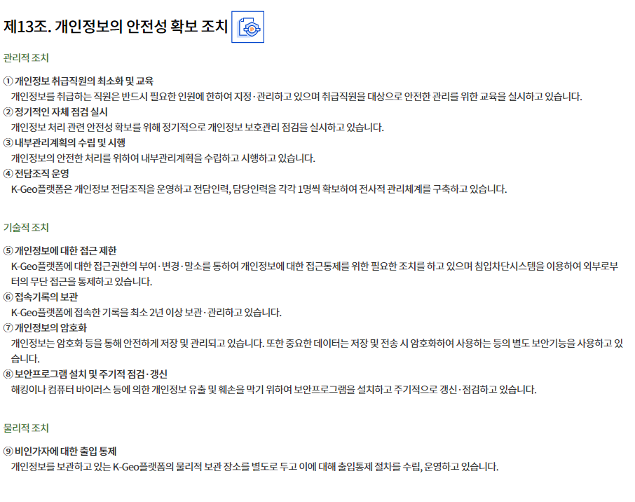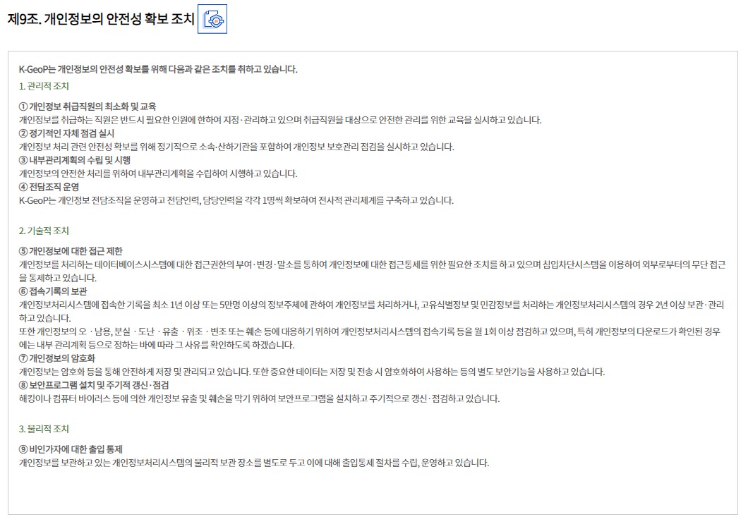 - K-GeoP는 개인정보의 안전성 확보를 위해 다음과 같은 조치를 취하고 있습니다.