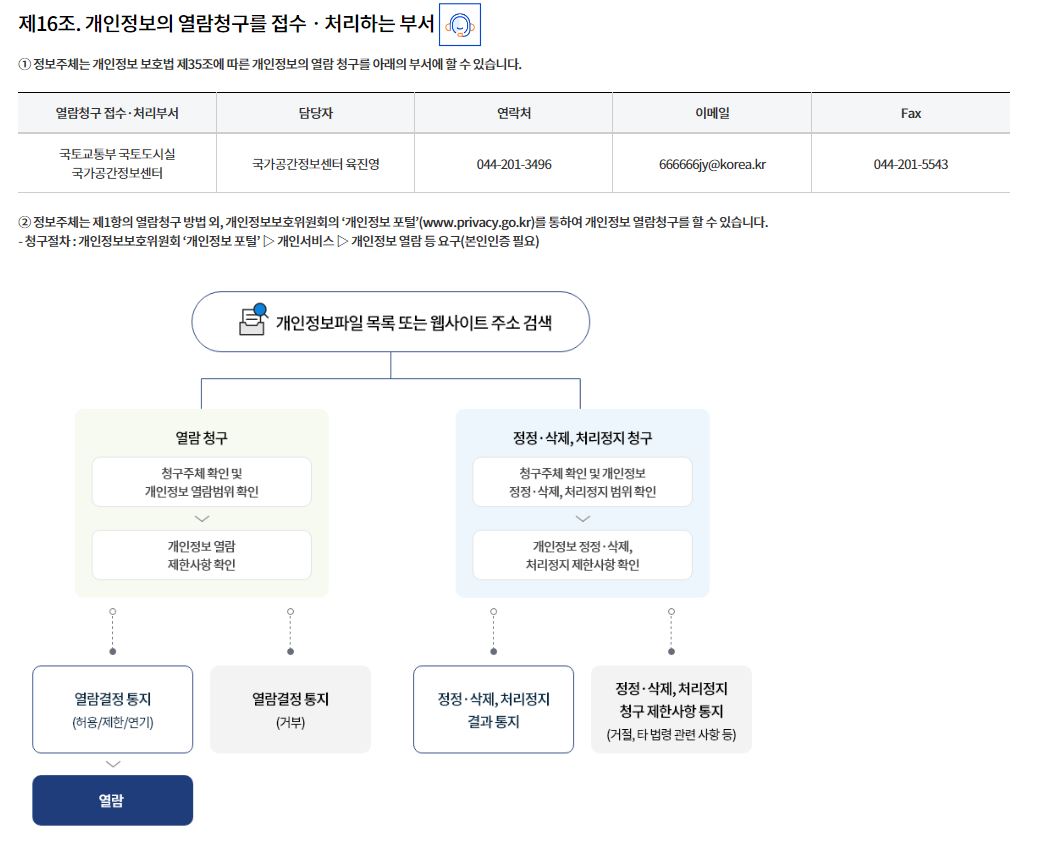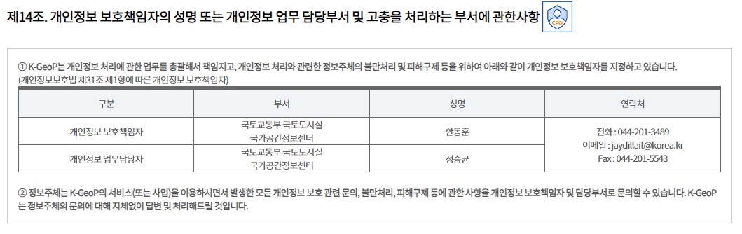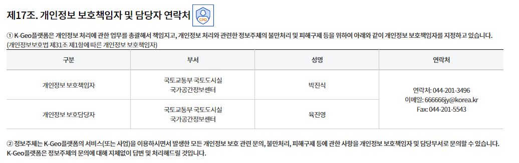 | 개인정보 업무담당자 | 국토교통부 국토도시실 국가공간정보센터 |
