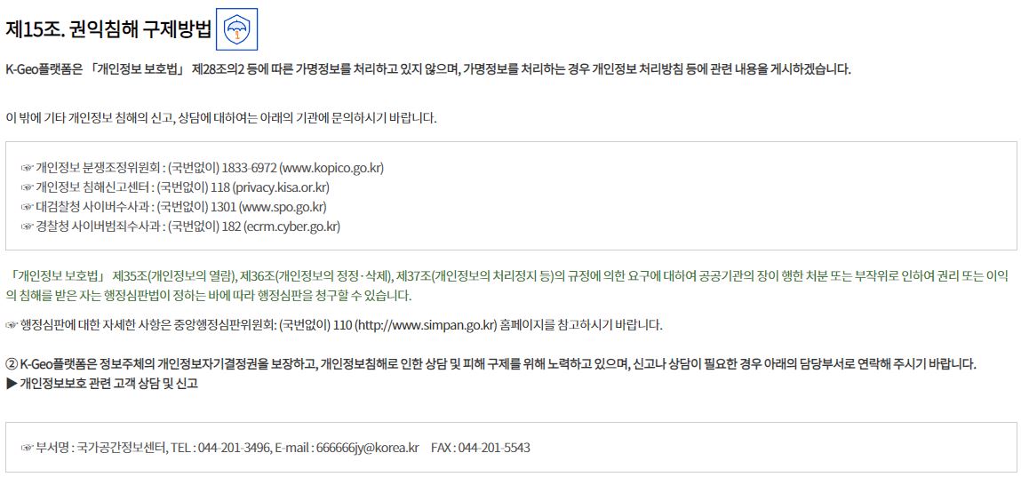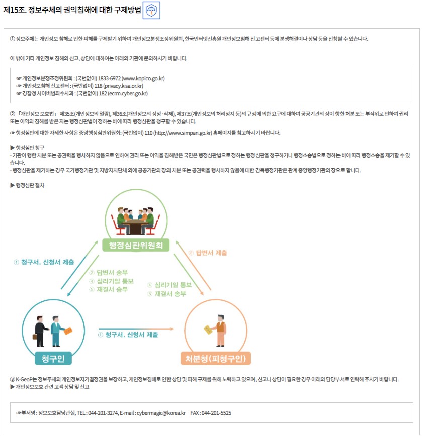 - ⑦ K-GeoP는 정보주체가 「개인정보 보호법」 제35조(개인정보의 열람), 제36조(개인정보의 정정·삭제), 제37조(개인정보의 처리정지 등)의 규정에 의한 요구 조치에 대하여 불복이 있는 경우 이의를 제기할 수 있도록 필요한 절차를 마련하고 안내하고 있습니다.