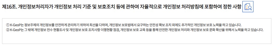 - ① K-GeoP는 정보주체의 개인정보를 안전하게 관리하기 위하여 최선을 다하며, 개인정보 보호법에서 요구하는 안전성 확보 조치 외에도 추가적인 개인정보 보호 노력을 하고 있습니다.