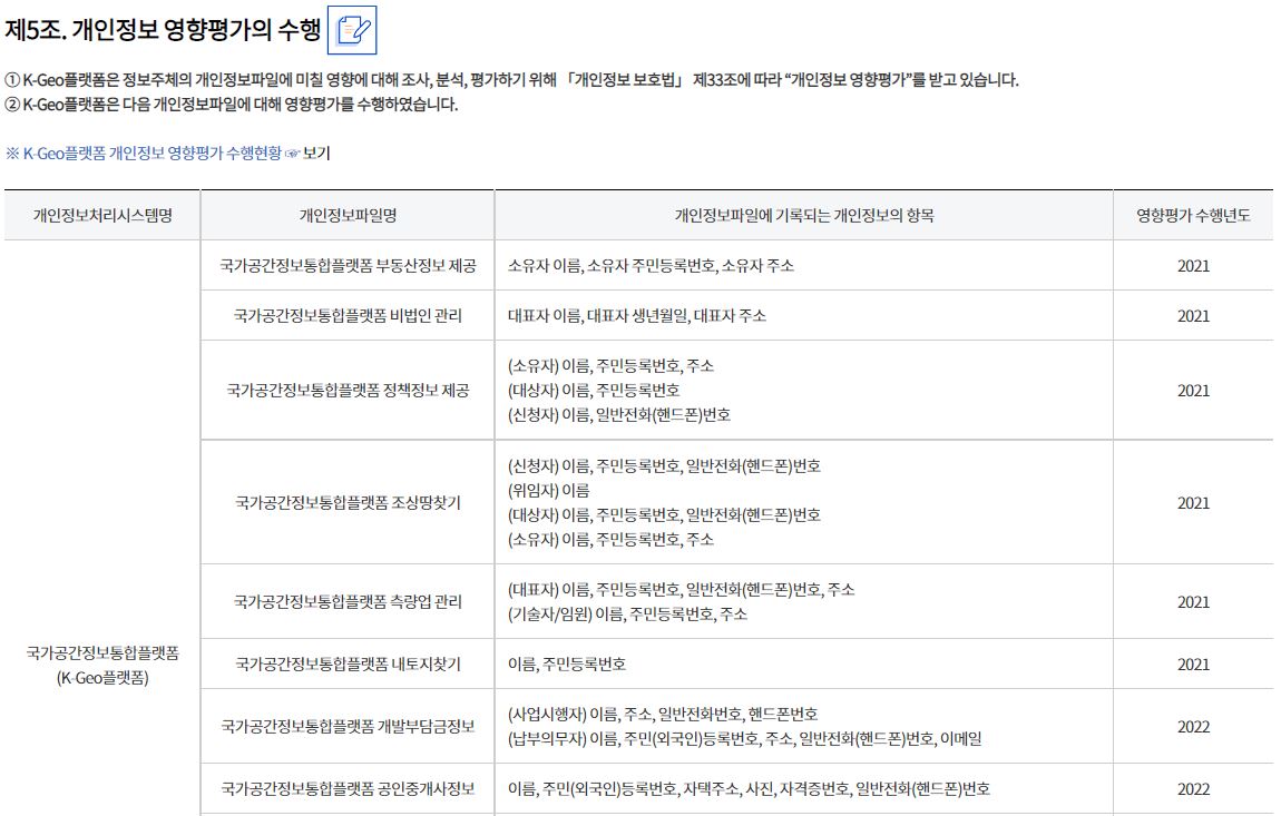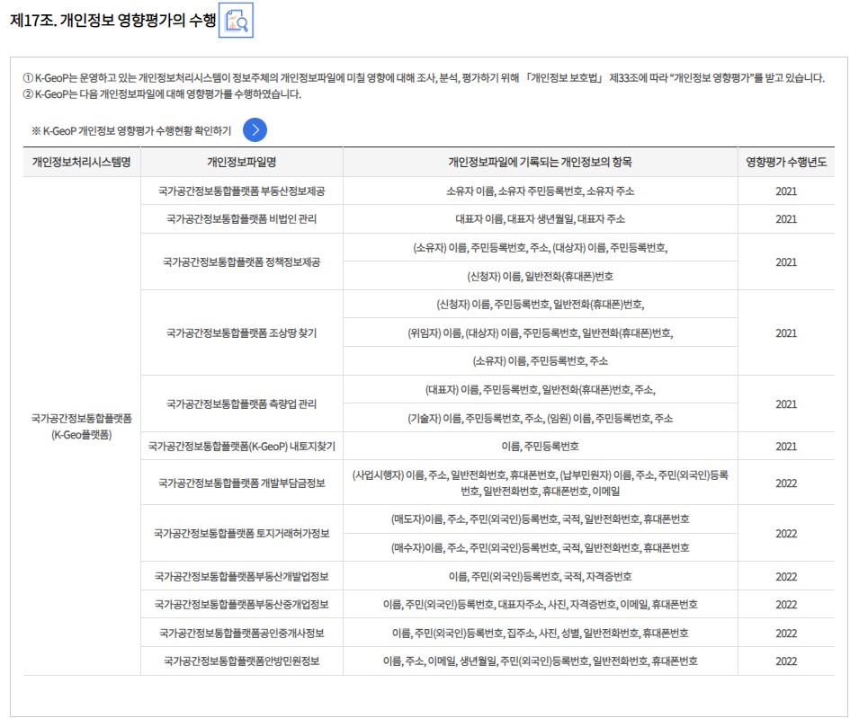 - ① K-GeoP는 운영하고 있는 개인정보처리시스템이 정보주체의 개인정보파일에 미칠 영향에 대해 조사, 분석, 평가하기 위해 「개인정보 보호법」 제33조에 따라 “개인정보 영향평가”를 받고 있습니다.