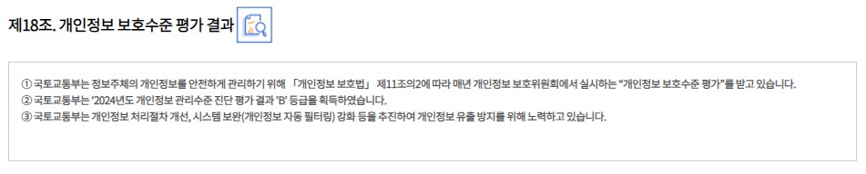- ② 국토교통부는 ‘2024년도 개인정보 관리수준 진단 평가 결과 ’B’ 등급을 획득하였습니다.