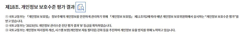 - ③ 국토교통부는 개인정보 처리절차 개선, 시스템 보완(개인정보 자동 필터링) 강화 등을 추진하여 개인정보 유출 방지를 위해 노력하고 있습니다.