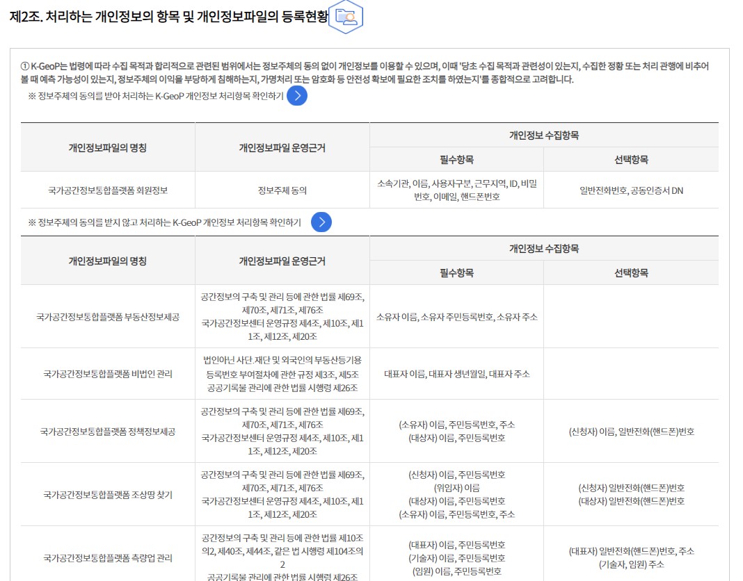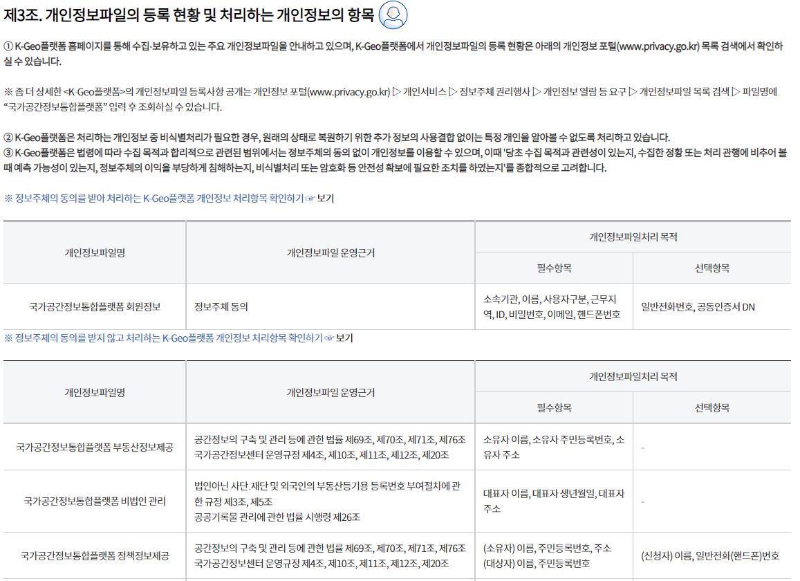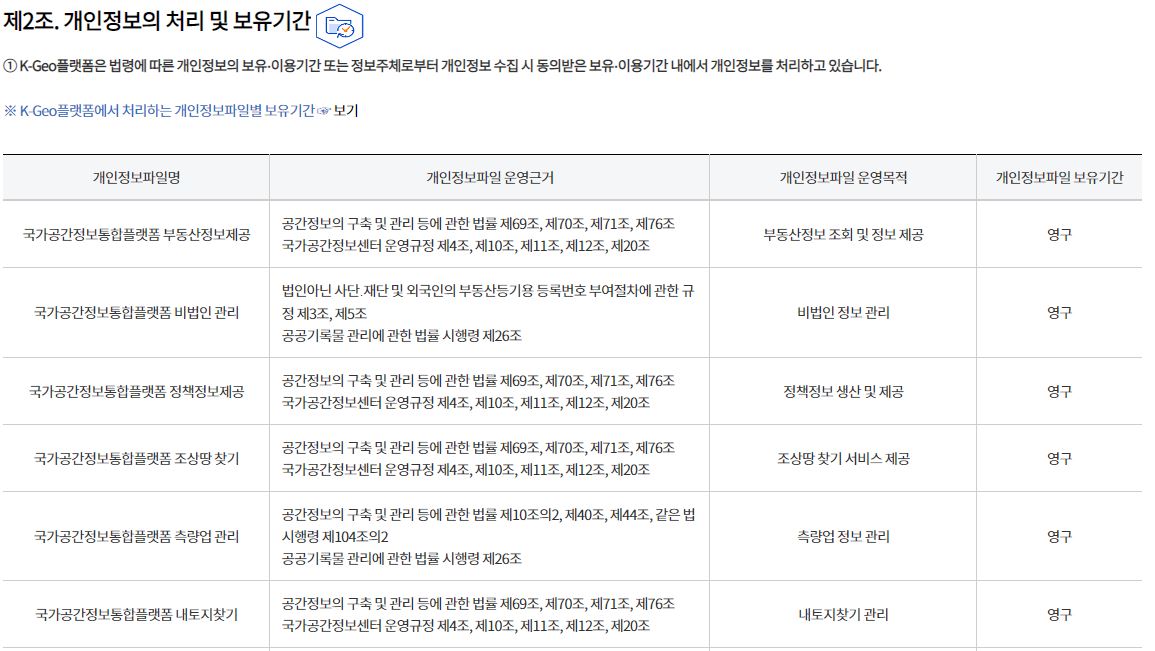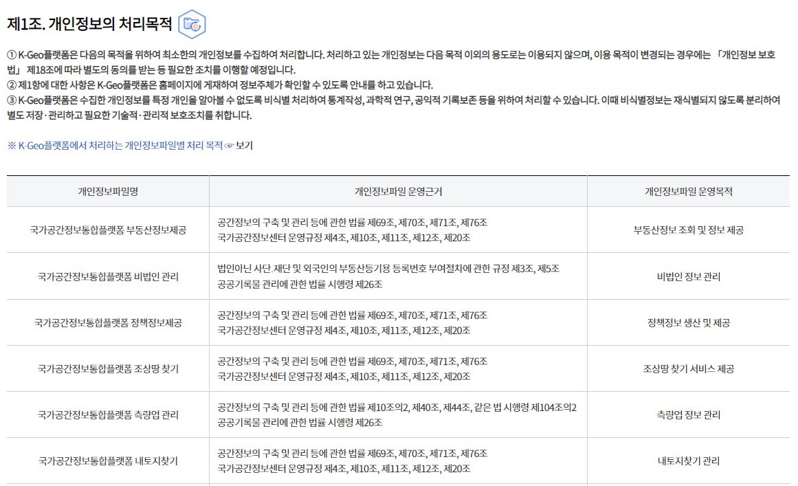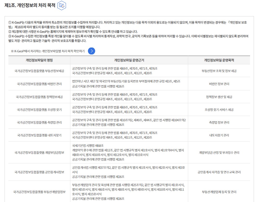 K-GeoP 개인정보의 처리목적 개인정보파일의 명칭 개인정보파일 운영근거 개인정보파일 운영목적 국가공간정보통합플랫폼 부동산정보제공 공간정보의 구축 및 관리 등에 관한 법률 제69조, 제70조, 제71조, 제76조