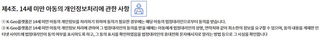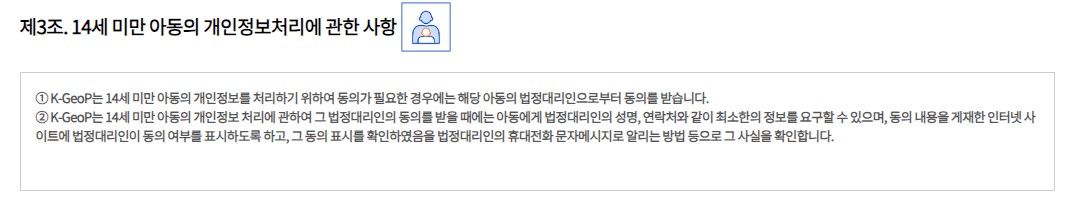 - ① K-GeoP는 14세 미만 아동의 개인정보를 처리하기 위하여 동의가 필요한 경우에는 해당 아동의 법정대리인으로부터 동의를 받습니다.