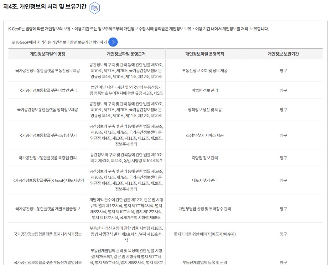 - ※ K-GeoP에서 처리하는 개인정보파일별 보유기간 확인하기