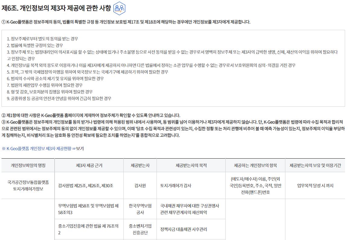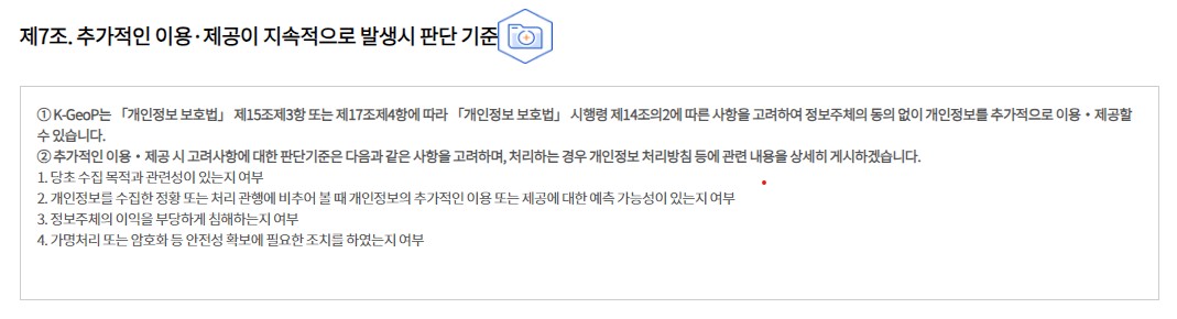 - ① K-GeoP는 정보주체의 동의를 받거나 법률의 특별한 규정 등이 있는 경우 「개인정보 보호법」 제17조에 따라 제3자에게 제공하고 있으며, 특히 개인정보의 수집ㆍ이용 목적 외 이용하거나 제3자에게 제공하는 것은 「개인정보 보호법」 제18조에 해당하는 경우에만 개인정보를 제3자에게 제공합니다.