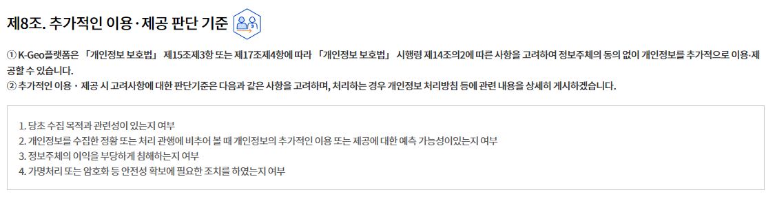 - ① K-GeoP는 「개인정보 보호법」 제15조제3항 또는 제17조제4항에 따라 「개인정보 보호법」 시행령 제14조의2에 따른 사항을 고려하여 정보주체의 동의 없이 개인정보를 추가적으로 이용・제공할 수 있습니다.